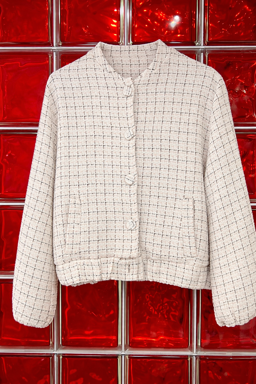 Veste courte à manches longues en tweed texturé écru, subtilement rehaussé de fils contrastés. Coupe droite légèrement ample, col rond et fermeture par boutons décoratifs. Une pièce élégante et intemporelle, idéale pour structurer une silhouette chic, portée aussi bien avec un jean qu’une jupe ou une robe.